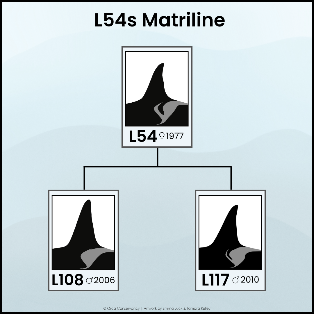 When L117 was a calf, it was unclear who his mother was, as he was regularly observed traveling near L5 Tanya. Ultimately, researchers confirmed L54 to be his mother.