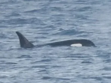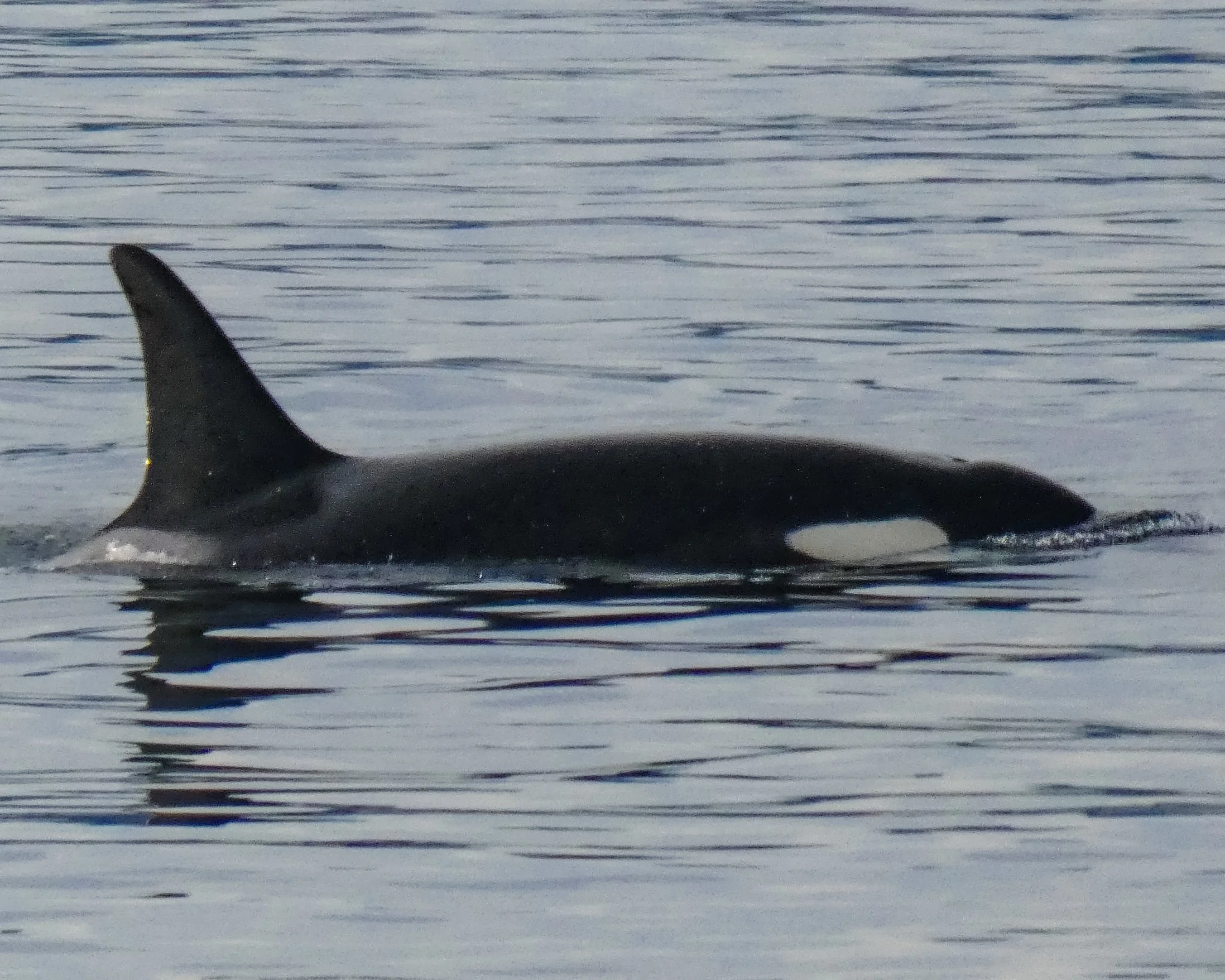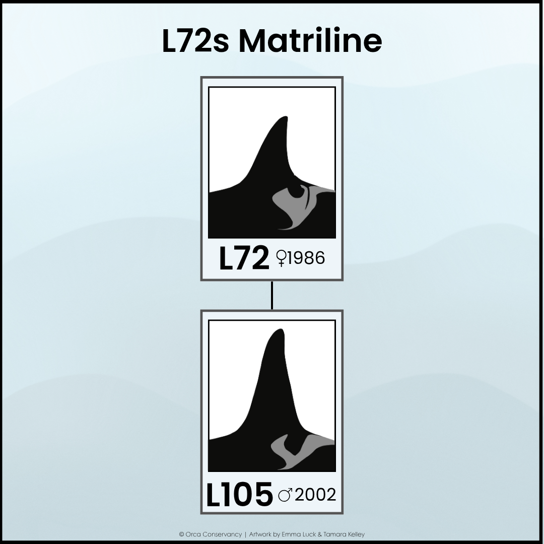 L105 Fluke is a fully sprouted male and the only surviving offspring of L72. He and his mother are the only orcas in the L72 matriline