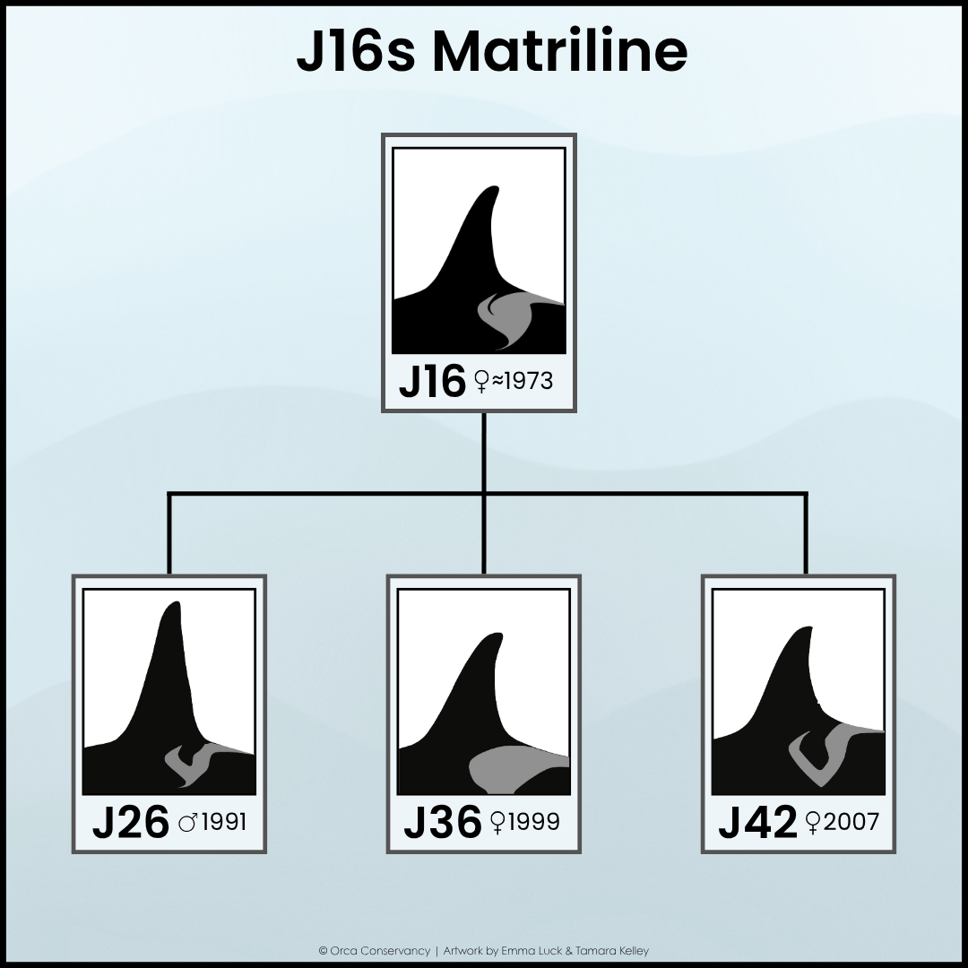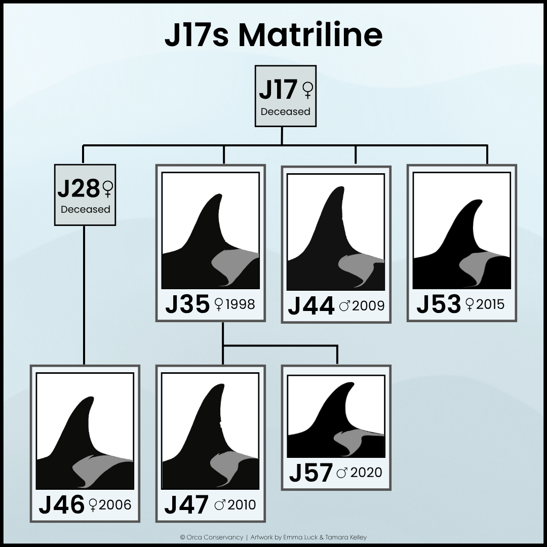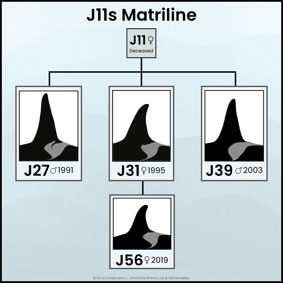 In 2016 J31 was observed carrying a deceased calf which was likely her first. She had a second calf J56 in May 2019.