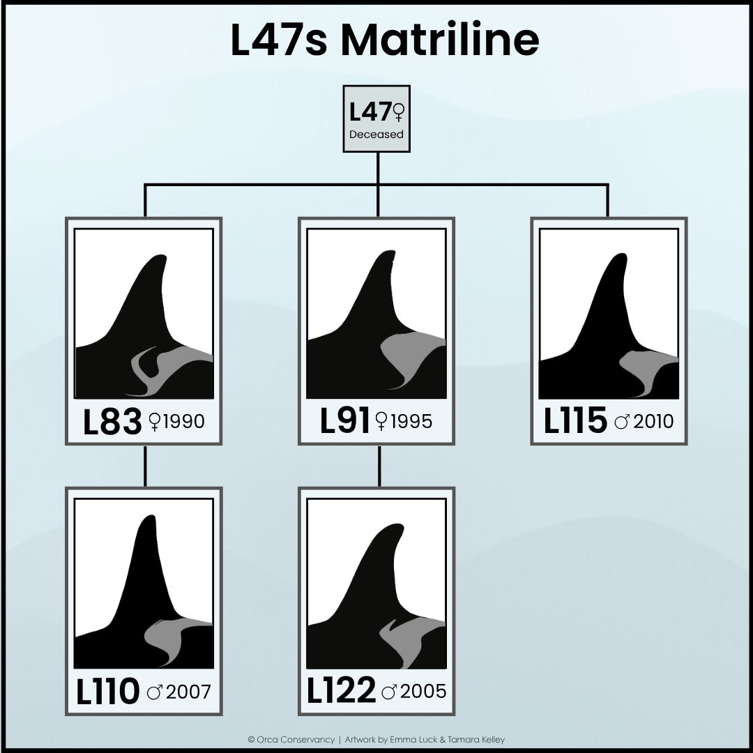 L83 Moonlight is a female killer whale and the first offspring born to L47 Marina. She is one of the three surviving offspring of L47. L83 and her calf, along with her siblings and their offspring all make up the L47 matriline.