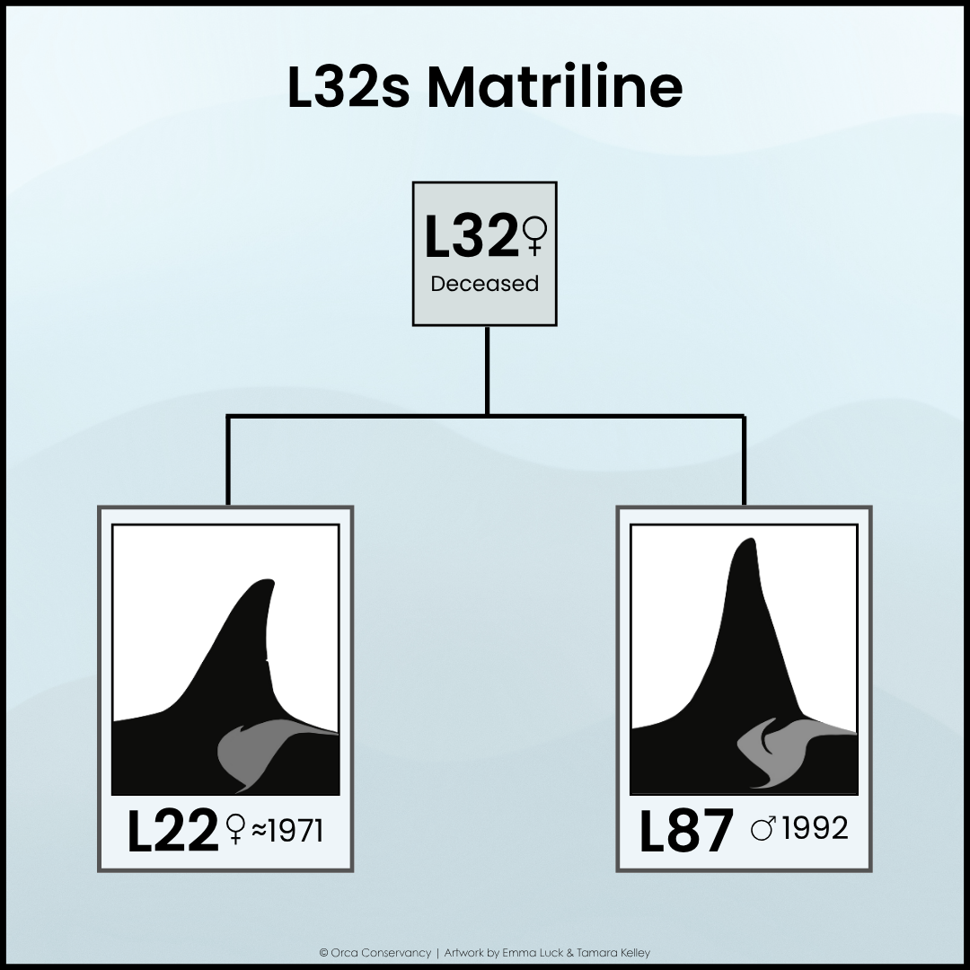 L87 is one of the two surviving calves to L32 Olympia (deceased). L87 was only 13 years old when his mother died, and after her death, he began famous for pod-switching.