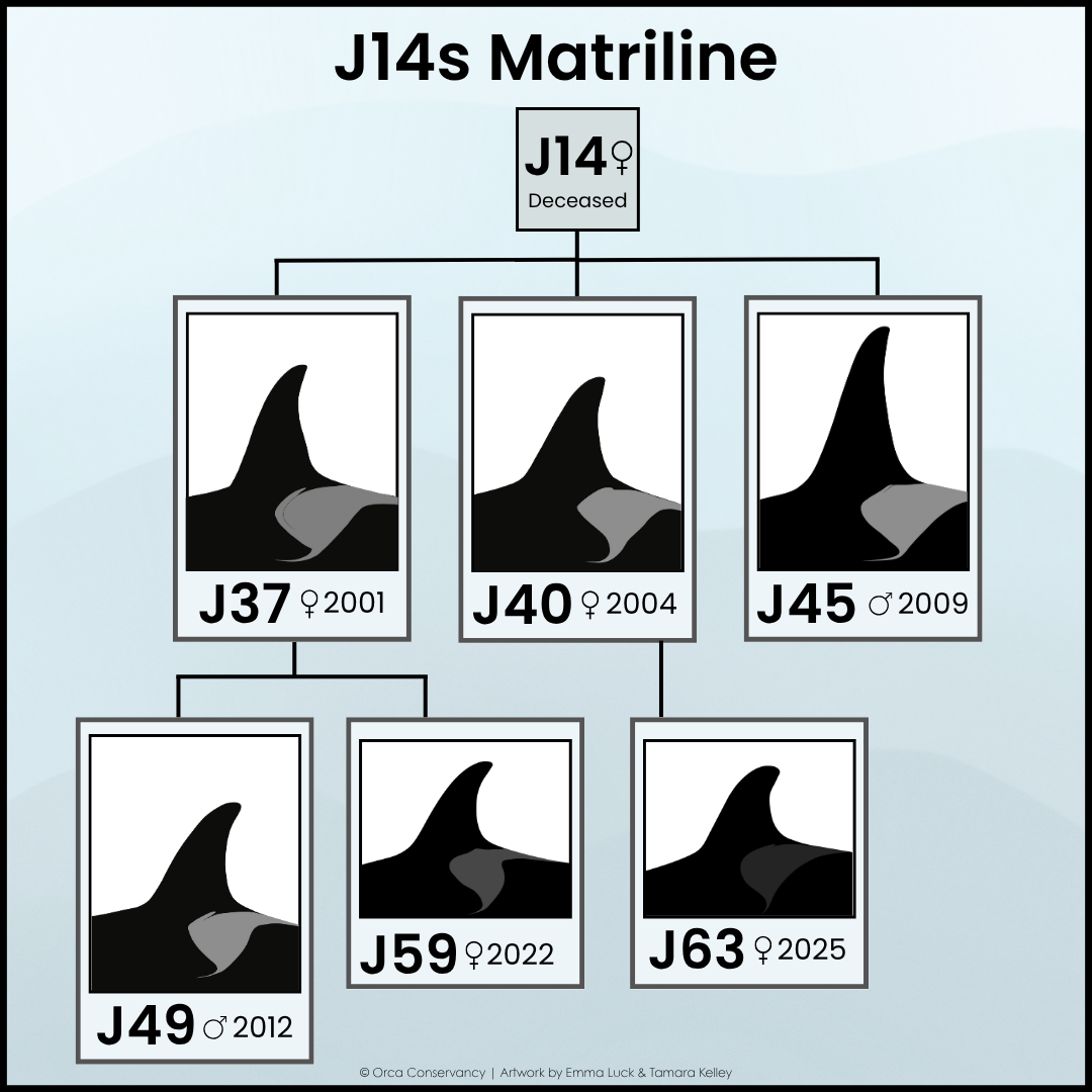 On April 6, 2025, the researchers documented a new calf traveling in the echelon position of J40. The calf, designated J63, was determined to be Suttle’s, making her a first-time mother.