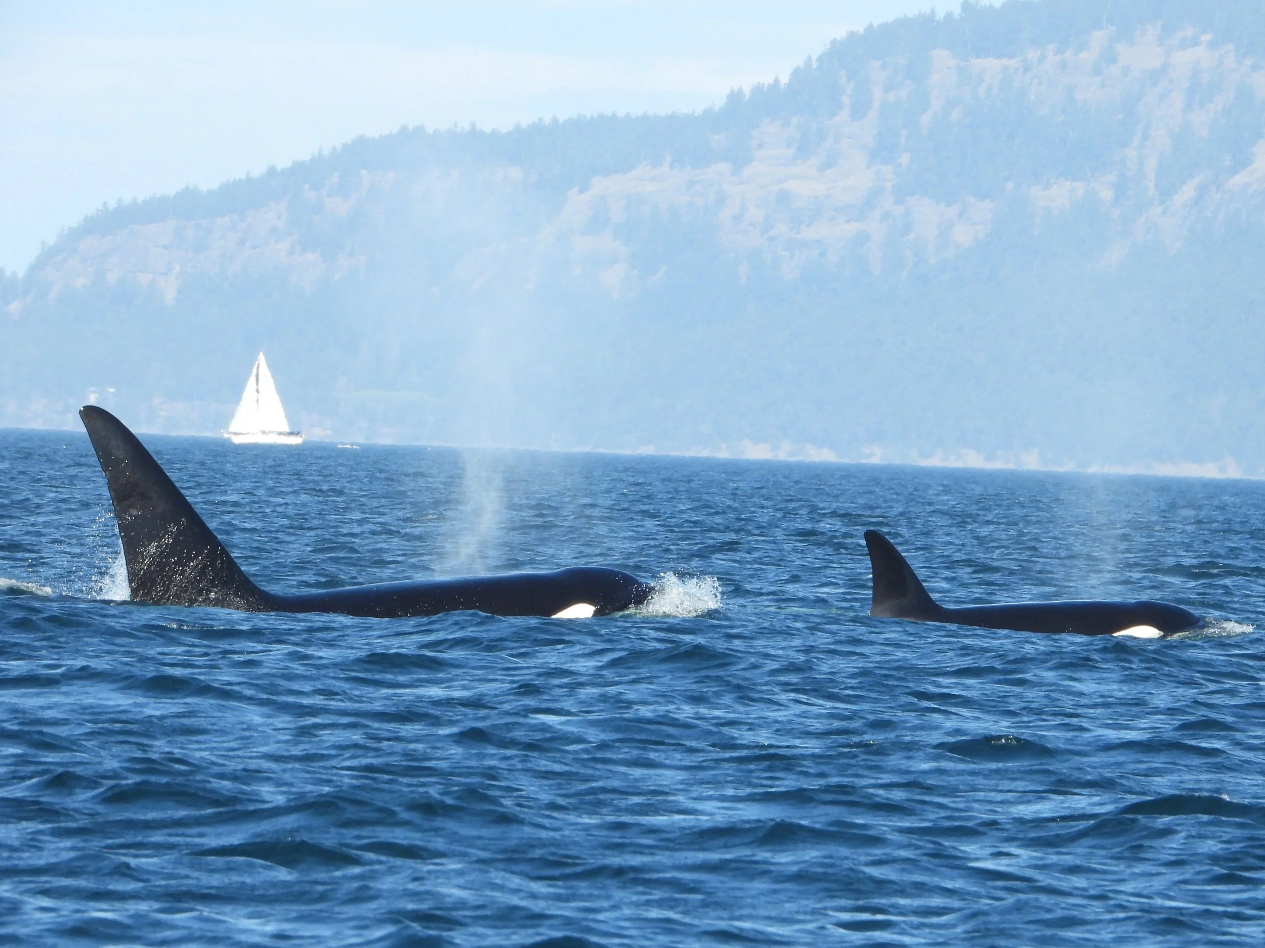 During the time we were viewing the humpbacks, reports of another group of killer whales off of Salmon or Hein Banks were coming in. Because these whales were quite far out, no one could get a positive ID on them. Based on the shore-based reporting, the numbers and behaviors sounded like it could possibly be Southern Residents. The crew had poor service, so I continued to keep tabs on the sightings relaying them to the crew. We knew that a day or two prior, J Pod had been spotted north at Campbell River in British Columbia, and the crew suspected they had made their way south, while I suspected it was either K or L Pod that had come in.